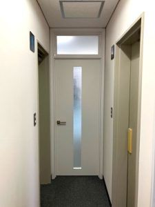 空気の流れを遮断せずに空調の冷気・暖気が流れるようランマ付きを提案させていただきました。ランマをガラス窓にすることで暗さも軽減されます。また、ガラススリット付きドアにすることで、開閉時に反対側に人がいないかわかるようにしました。