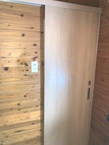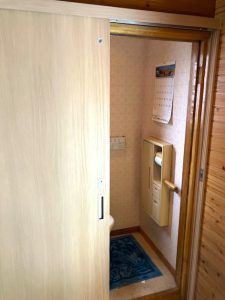壁を壊してドア枠から交換すると壁紙の貼替も必要になってしまいますが、今回はドア枠をそのまま残し、廊下側にアウトセット式の引き戸を取付けました。