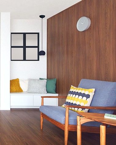 採用した木目のインテリアパネルは、木のぬくもりを感じながらも、圧迫感を抑えた明るい色合いがポイントです。床材との統一感が生まれたことで、リビング全体が一体感のある心地よい空間になりました。