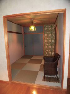 薄紫色の壁紙、紫色の襖、グレーの縁なし半畳で